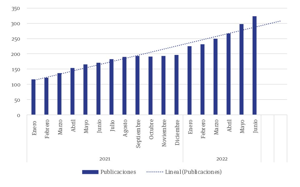 La actividad digital de Nube Ciega inició con la creación de su perfil de Instagram y su primer posteo el 2 de mayo de 2020. En marzo de 2020 comenzaron las medidas de confinamiento en México por la Covid-19, es decir, hay un mes de diferencia entre esas medidas y el inicio de actividades digitales, a partir de entonces, la gráfica 1 muestra la constancia e incremento en el número de publicaciones a lo largo del periodo de seguimiento digital.