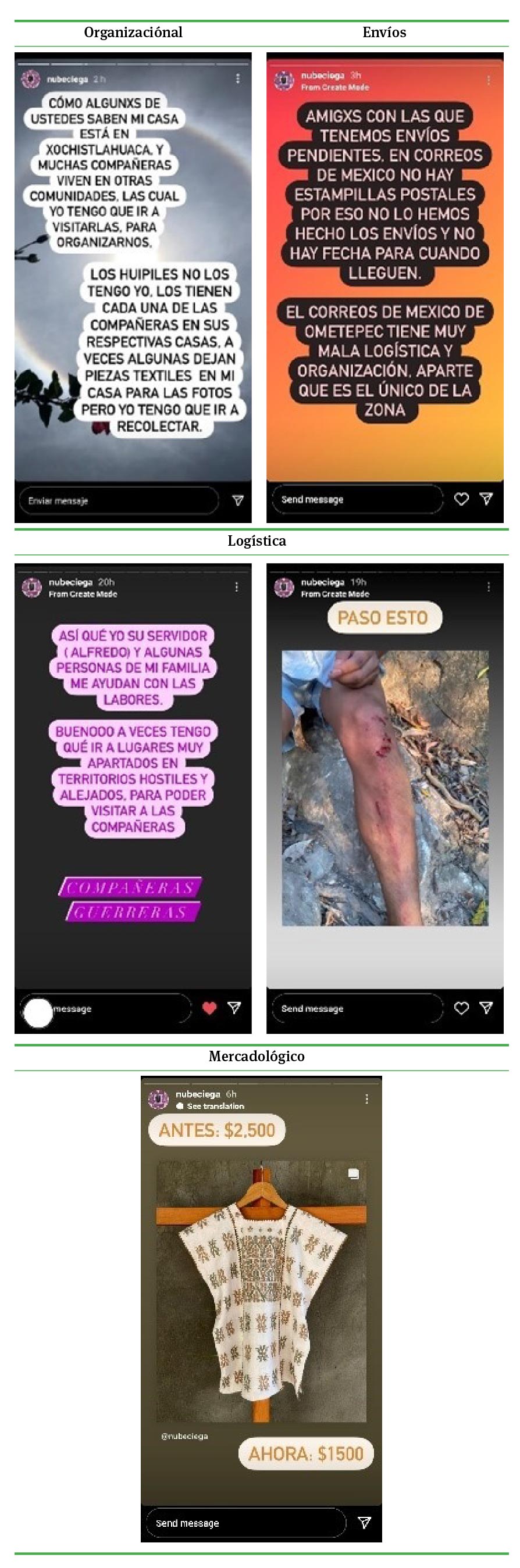 Al identificar los diversos usos de Instagram que la empresa Nube Ciega hace, también se pueden identificar otro tipo de cambios a lo largo del tiempo. Cambios que se reflejan en el modelo de negocios de la empresa, en este sentido, en lo que respecta a la organización interna de la empresa, de acuerdo a mensajes compartidos en historias (tabla 4. Ejemplo Organizacional) así como un acercamiento en formato entrevista al artesano Alfredo Ramírez, se identificó que debido a la pandemia el desplazamiento de las artesanas se detuvo, pero la necesidad de venta no, así, surgió la idea de la familia Ramírez, familia central de la empresa, de compartir fotografías de las piezas artesanales mediante sus redes sociales privadas como un intento de promover las ventas. El resultado fue exitoso, observaron que existía un público interesado en las piezas artesanales textiles por lo que tomaron la decisión de comprometerse con sus actividades digitales creando perfiles específicos para Nube Ciega e ir construyendo una identidad digital empresarial propia. La estructura organizacional al participar en el espacio digital colocó al artesano Alfredo Ramírez al frente de la administración de redes sociales y como principal enlace con las demás artesanas.