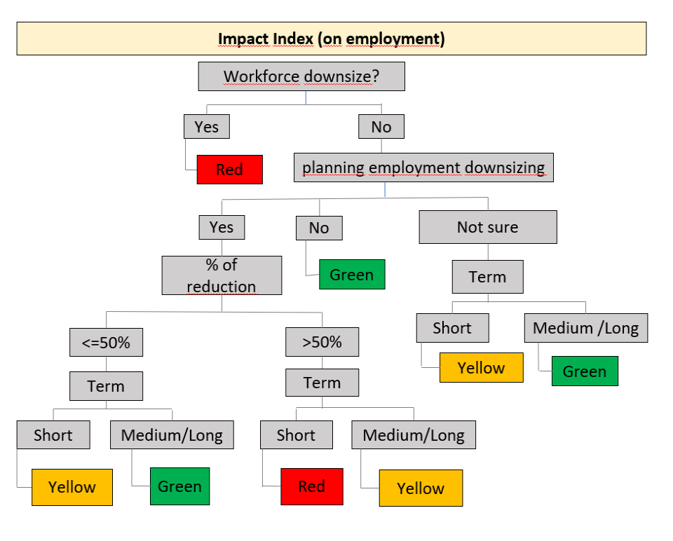 The global impact index is constructed to describe the affectation level in companies concerning the levels of job loss, hours worked, and income levels. This indicator allows the answers to nine questions of the questionnaire to be integrated into a single variable, according to the level presented by the index. A color is assigned where green means “minor affectation”, yellow “intermediate affectation” and red “severe affectation”. In general, green does not mean an absence of affectation, but rather that it is less concerning than in the other two cases. The global impact index was made up of the first stage of the research´s questions (May 2020). Figure 1 shows the logical sequence of the survey to assign the different global impact indices (colors).