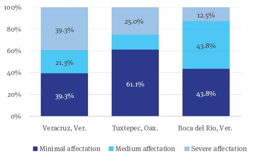 Although practically all the companies considered in the research had some degree of affectation, figure 2 shows that Veracruz was the most affected with 40%; while Boca del Río was the least affected (12.5%). Also, Tuxtepec, Oaxaca registered a severe affectation, but intermediate between both municipalities.
