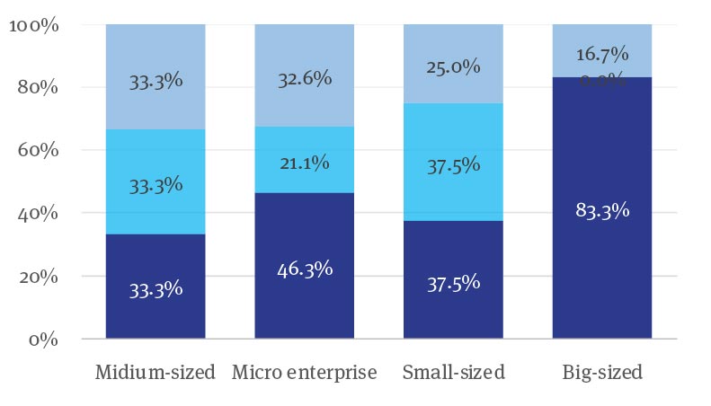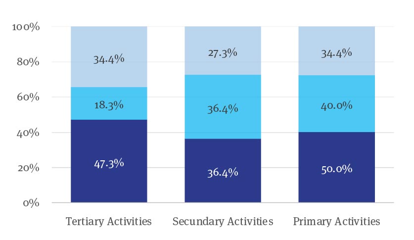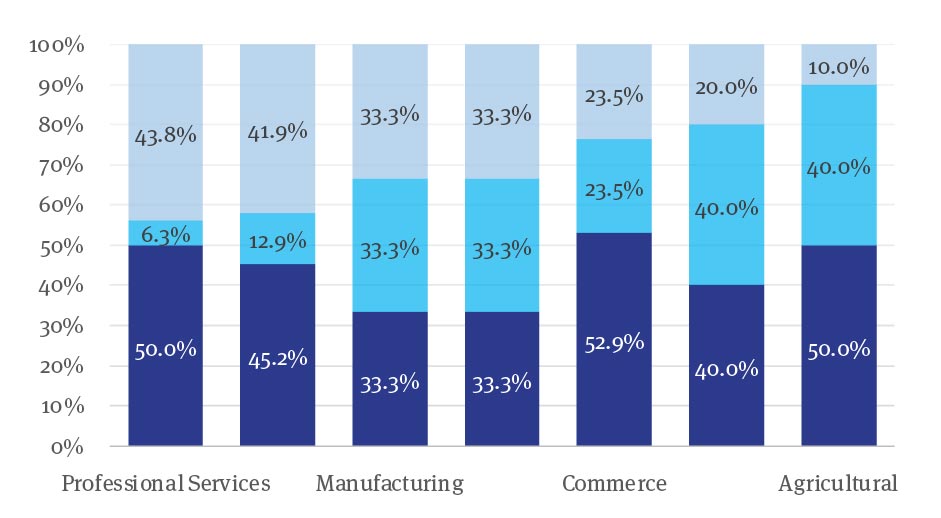 About the sector, figure 3 shows that the tertiary and primary sectors were the most affected (34.4%, respectively) and, to a lesser extent, the secondary (27.3%), but at the subsector level (figure 4) specific tendencies are observed. Contrary to what was expected due to the tourist activity in the studied area, tourist services had a severe but intermediate impact (33.3%). Among those most affected are professional services at 43.8% and the least severely affected agricultural companies at 10%.