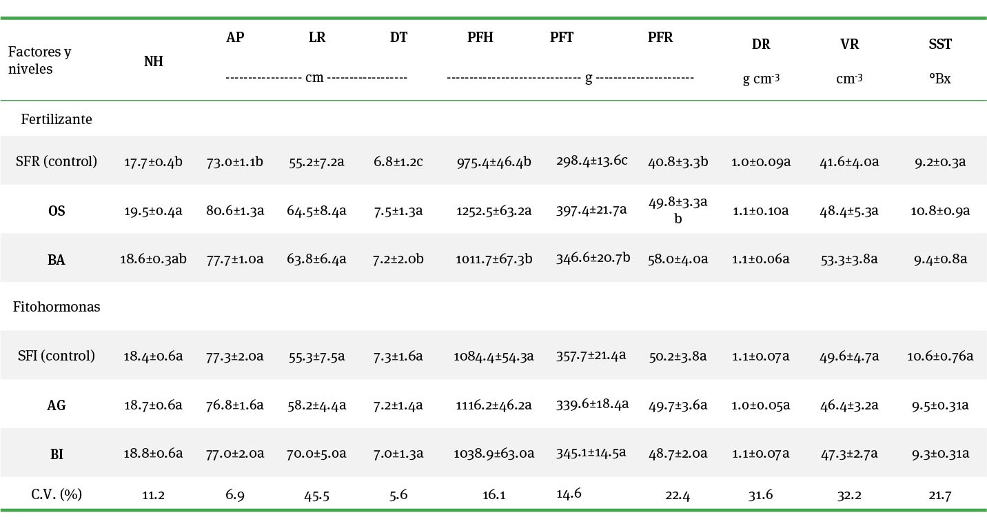 Nota: sfr, sin fertilizante; os, osmocote plus; ba, basacote plus; sfi, sin fitohormonas; ag, agromyl; bi, biozyme; C.V. coeficiente de variación. Medias con la misma letra en cada columna no son estadísticamente diferentes (Tukey < .05).