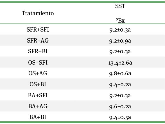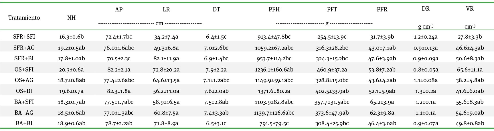 Nota: SFR, sin fertilizante; SFI, sin fitohormona; AG, agromyl; BI, biozyme; OS, osmocote plus; BA, basacote plus. Medias con la misma letra en cada columna no son estadísticamente diferentes (Tukey < .05).