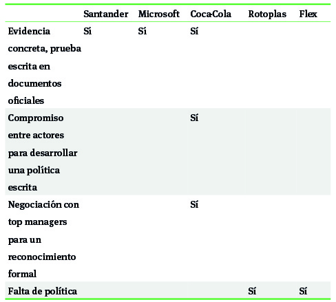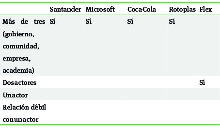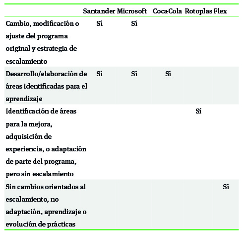 Los resultados para cada uno de los casos con relación a los macro grupos y sus respectivos indicadores particulares fueron sintetizados en seis cuadros que se presentan más adelante: a) escalamiento; b) condiciones; c) alineación de la iniciativa con la estrategia central o la visión corporativa; d) participación de la red tripartita; e) incremento en la capacidad de innovación, y f) institucionalización de la iniciativa.