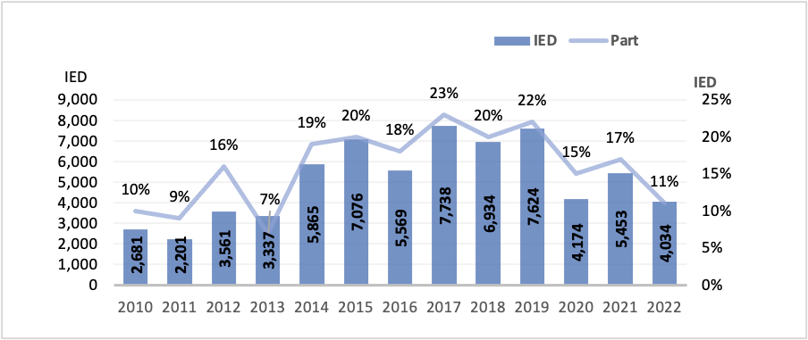 Por otra parte, en una lectura de más largo plazo, con base en el estudio de BBVA Situación Sectorial Regional I-2023 de los flujos de ied por cuatrienios, advertimos que en el periodo 2018-2022 ingresaron al país 190 mil millones de dólares, cantidad menor que los 235 mil millones del periodo 2013-2017, así como la ied relativa al periodo 2003-2007.13