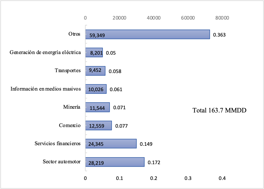 No obstante, la situación es diferente para la iam. De acuerdo con la amia (2023a) en los últimos cinco años, 20 de cada 100 dólares que ingresaron al país por concepto de ied se han dirigido a la iam. El monto total de ied en el periodo 2017-2022 fue de 28 mil millones de dólares, lo que coloca al sector como el primer receptor de flujos de inversión, por encima de sectores que tradicionalmente captan grandes cantidades de flujos como el de servicios financieros y el comercio. Ver Figuras 6 y 7.