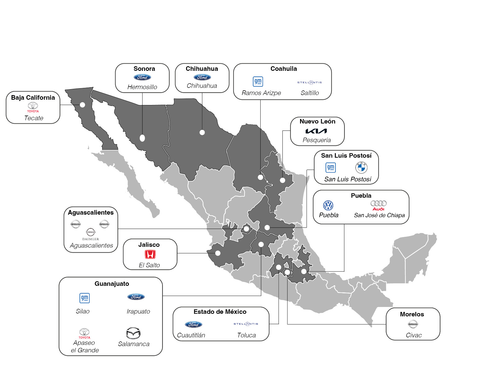 Asociación Mexicana de la Industria Automotriz, A.C. [AMIA] (2022) Plantas de ensamble de vehículos, motores y transmisiones de empresas asociadas. México: AMIA, Recuperado de https://www.amia.com.mx/about/plantas_ensamble/