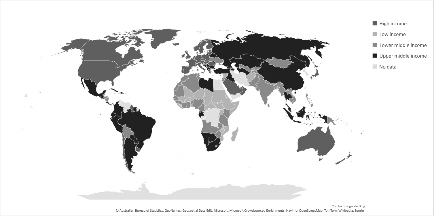 La Figura 1 muestra la clasificación que hace el Banco Mundial del ingreso en el mundo. En dicha gráfica México se ubica en el nivel de ingreso medio alto.