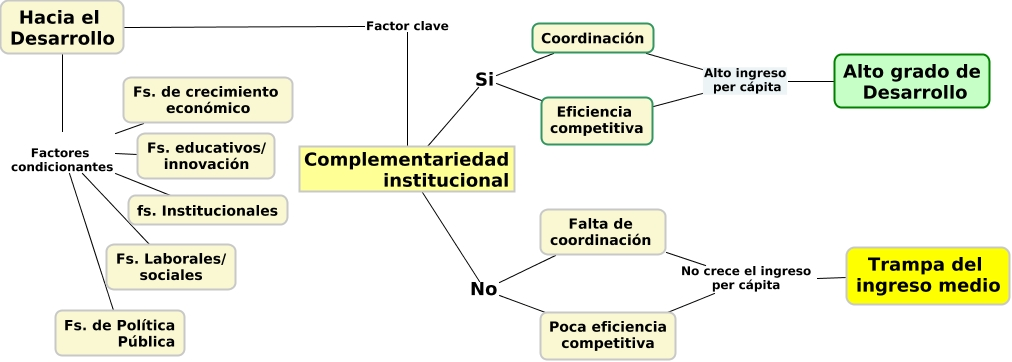 La Figura 2 representa nuestras proposiciones. Con ellas formulamos un modelo alternativo para explicar la tim. Las cinco categorías de factores que los estudiosos han identificado como elementos críticos que conducen a la trampa, en nuestro análisis representan grandes factores del desarrollo. Ello indica que bajo su impacto un país de ingreso medio puede ponerse en camino del desarrollo. Lo conseguirá, si y sólo si despliega ejercicios de complementariedad institucional que se puedan traducir en eficiencia competitiva, coordinación e innovación sistémica. De otra suerte, la tim seguirá reinando.