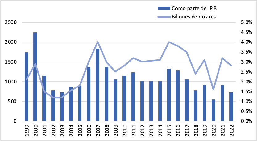 El supuesto es que, como efecto de la reestructuración de las cadenas globales, el nearshoring como estrategia corporativa podrá atraer más flujos de inversión a la región. Se ha estimado que su impacto puede sumar hasta 70 mil millones de dólares en América Latina, y la mitad de esta cantidad se destinaría a México. Sin embargo, visto a nivel de economía en general, hasta el momento los signos de dichos impactos no son contundentes, a pesar de que en 2022 la ied que entró a México creció 12% respecto al año anterior.