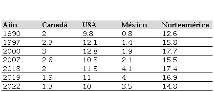 Para Covarrubias (2021), al cierre del tlcan, México y Canadá no sólo cambiaron posiciones, sino que la contribución de México al mercado de Norteamérica creció notablemente: en 1990 México manufacturó el 6% de la producción total automotriz de Norteamérica, en tanto Estados Unidos y Canadá fabricaron 78 y 16%, respectivamente; con el tlcan la historia cambió porque en 2000 México ya había doblado la producción del sector; pero el gran impulso vendría con el quiebre de la crisis global de 2008-2009 (p.153), ya que desde entonces y hasta la conclusión de este ciclo expansivo, la producción de la iam se incrementó año con año, de forma que al cierre del tlcan (2019) México generó el 24% de la producción regional, mientras Estados Unidos aportó 65% y Canadá el 11% restante. Esta contribución de la iam se mantuvo en 2022 (Tabla 1).