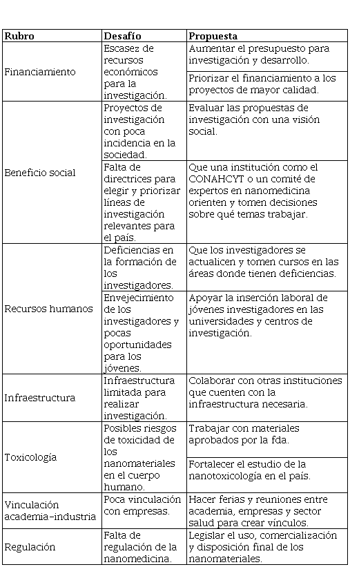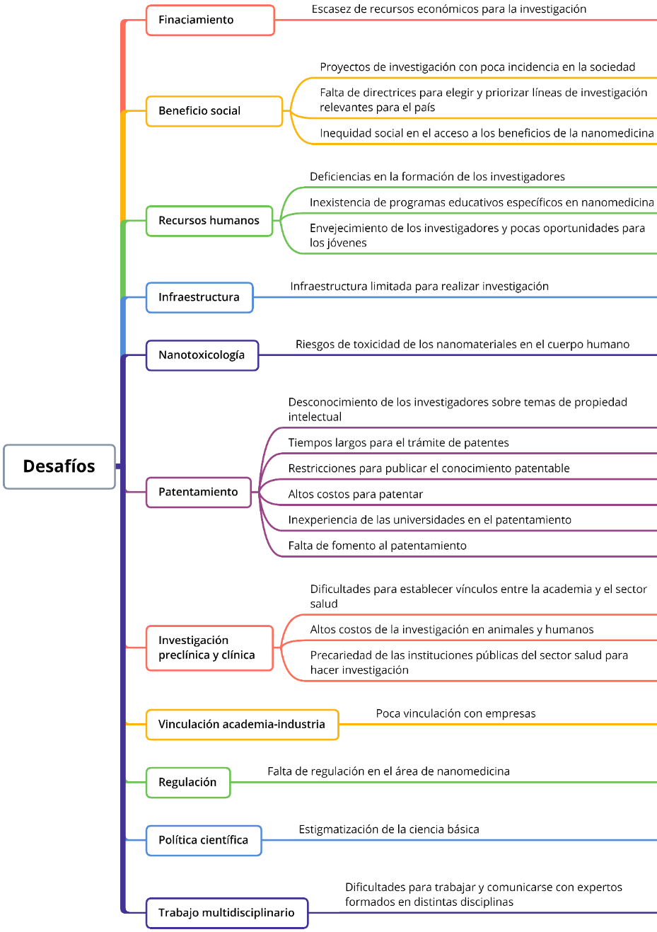 Resultados: se identificaron desafíos en distintos rubros: financiamiento, beneficio social, recursos humanos, infraestructura, nanotoxicología, patentamiento, investigación preclínica y clínica, vinculación academia-industria, regulación, política científica y trabajo multidisciplinario.