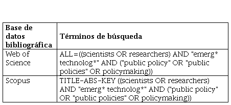 A continuación se presenta una revisión sistemática de la literatura sobre el papel de los científicos en la formulación de políticas públicas para las tecnologías emergentes. Una revisión sistemática implica la consulta de fuentes de información relevantes mediante la aplicación de métodos transparentes y reproducibles (Lame, 2019). En concordancia con lo anterior, se realizó una búsqueda de publicaciones en Web of Science y Scopus (las principales bases de datos científicas a nivel internacional) y se aplicaron los criterios de búsqueda mostrados en la tabla 1.