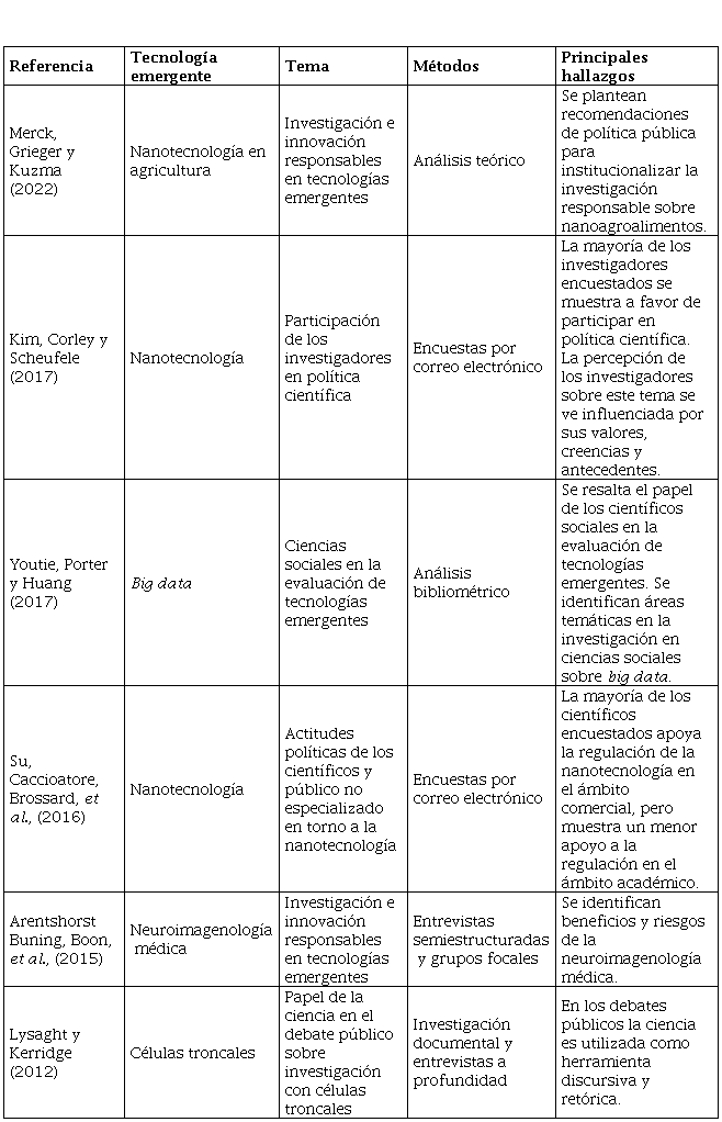 La búsqueda arrojó 20 resultados en Web of Science y 29 en Scopus. Se realizó una revisión cuidadosa de cada uno de los documentos localizados, descartando los que estaban repetidos y los no relacionados con el tema. Este proceso de depuración dio como resultado la selección de artículos mostrada en la tabla 2 con la cual se llevó a cabo la revisión de la literatura. En dicha tabla se especifican los temas estudiados, los tipos de tecnologías emergentes, los métodos utilizados y los principales hallazgos de cada artículo. La mitad de ellos versa sobre nanotecnología y el resto se dirige a otras tecnologías emergentes como big data, neuroimagenología médica y células troncales. Los temas abordados comprenden la participación de científicos en política, el papel de la ciencia en el debate público, la investigación e innovación responsables y la aplicación de las ciencias sociales en la evaluación de tecnologías emergentes.
