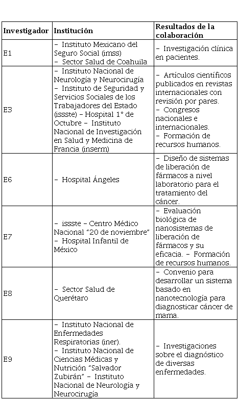 A pesar de estas dificultades, otros de los entrevistados han logrado entablar colaboraciones con el sector salud (véase la tabla 4). La mayoría de estas colaboraciones han sido con instituciones públicas de salud y los resultados de dichas colaboraciones corresponden a investigación básica y preclínica, sin llegar todavía a productos médicos terminados.