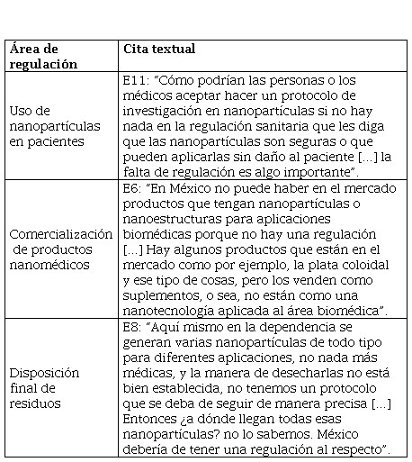 Los entrevistados señalaron que otro desafío es la falta de regulación en nanomedicina, indicando específicamente tres áreas de regulación: uso de nanopartículas en pacientes, comercialización de productos nanomédicos y disposición final de residuos (tabla 6).