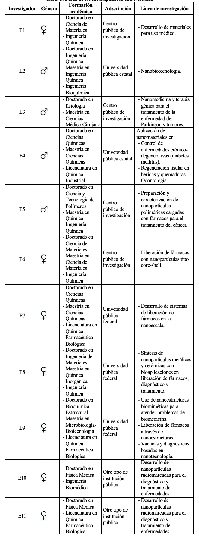 Methodological design: Semi-structured interviews were conducted with Mexican researchers in the field of nanomedicine. The participants were selected through purposive sampling. Interviews were both online and face-to-face. The information was processed with ATLAS.ti software.