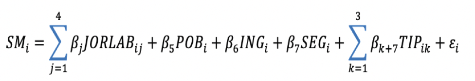 Donde SM se refiere al número de consultas de salud mental, JORLAB indica cada una de las cuatro clasificaciones respecto a la jornada laboral, POB representa el tamaño de la población, ING es el ingreso por hora trabajada de la población ocupada en promedio, SEG se trata del porcentaje de población sin acceso a servicios de salud y TIP se refiere a la proporción de personas con un tipo de empleo que puede ser categorizado en el sector primario, secundario o terciario.