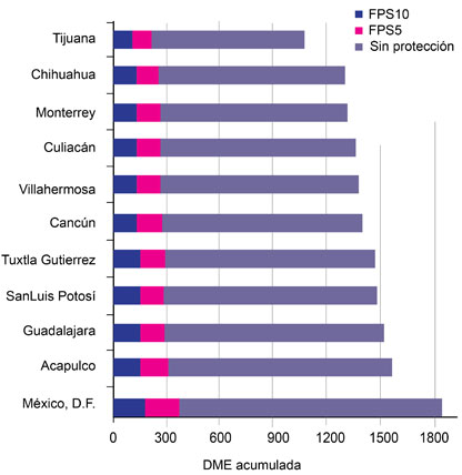 Desde el nacimiento hasta los 70 años de edad, el uso de un filtro solar que brinde una protección de 5 antes de la hora de exposición diaria, reduce de 1421 ± 191 a 284 ± 38 DME en promedio para el conjunto de ciudades analizadas. Por lo tanto, como se aprecia en la figura 1, la aplicación de un FPS de 10 reduce al doble la DME acumulada (142 ± 19). Por otra parte, y bajo este mismo escenario, la fotoprotección tardía también reduce de forma significativa la dosis acumulada, ya que el uso de un FPS 5 desde los 60 años reduce de 1071 a 971 las DME recibidas, es decir, 9 % menos del total adquirido sin fotoprotección (ANOVA, p < 0.001).