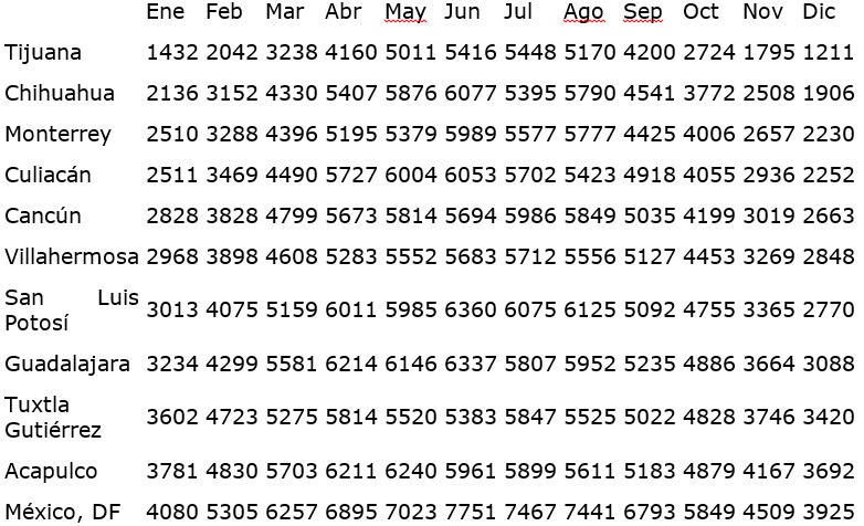 Promedio diario de radiación ultravioleta ambiental total que incide sobre la cara y brazos, expresada en dosis mínima eritematógena. Se muestran por periodos mensuales en 11 ciudades de México