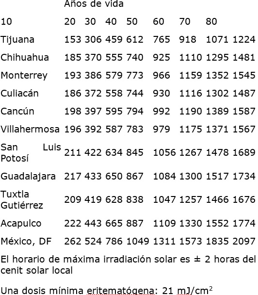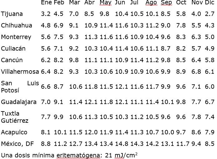 Resultados: la radiación UV es menor en diciembre y máxima de mayo a julio. La localidad con menor dosis anual es Tijuana y la máxima el Distrito Federal. La diferencia anual entre estas regiones es de 58 %. Durante la vida, un filtro solar de baja potencia puede reducir hasta 66 % la dosis recibida.