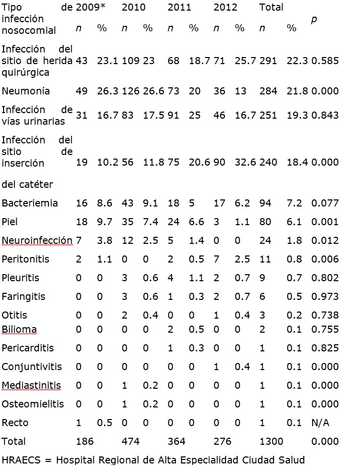 En el cuadro I se puede observar el recuento completo de estas infecciones y el patrón cambiante de los eventos a lo largo de los cuatro años de seguimiento; se observa una disminución en el número y la proporción de las neumonías durante el periodo, que va de 26.6 % (n = 126) en 2010 a 13 % (n = 36) en 2012 (p < 0.000); inversamente, las infecciones del sitio de inserción del catéter pasaron de 11.8 % (n = 56) en 2010 a 32.6 % (n = 90) en 2012 (p < 0.000); también se observan cambios significativos en las infecciones de la piel (que disminuyeron del 7.4 al 1.1 %), en las neuroinfecciones (que también disminuyeron del 2.5 al 0 %) y en las peritonitis (las cuales aumentaron del 0.0 al 2.5 %).