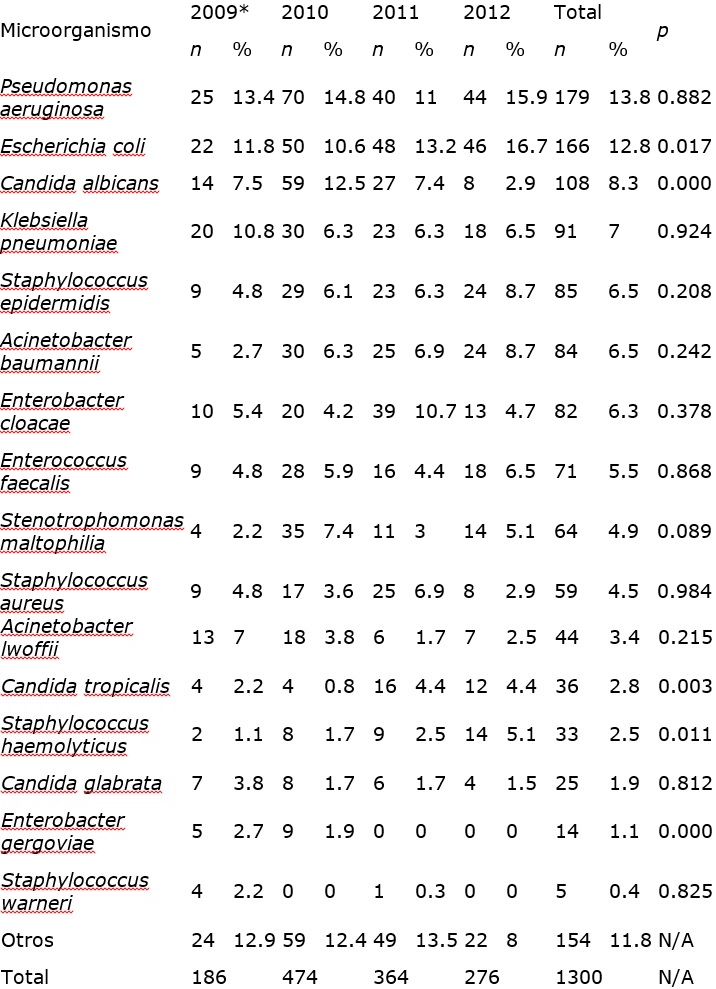 El cuadro II muestra los 16 gérmenes más frecuentemente aislados de 2009 a 2012; estas 16 especies representan el 88.1 % del número total de aislados; también puede revisarse el cambio en la frecuencia durante los años observados de estos patógenos; a pesar de que en el número total Pseudomonas aeruginosa es el germen más importante, durante los dos últimos años de registro (2011 y 2012) Escherichia coli se presentó con mayor frecuencia y pasó significativamente del 11.8 % en 2009 al 16.7 % en 2012. Se observa también que Acinetobacter baumannii pasó de 2.7 a 8.7 % respecto al total de gérmenes aislados por año, mientras que Candida albicans disminuyó significativamente su proporción del 7.5 al 2.9 % durante el periodo.