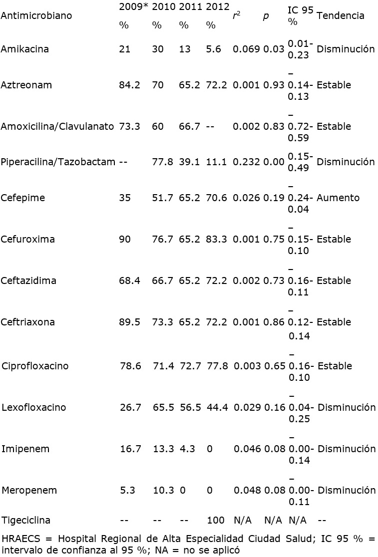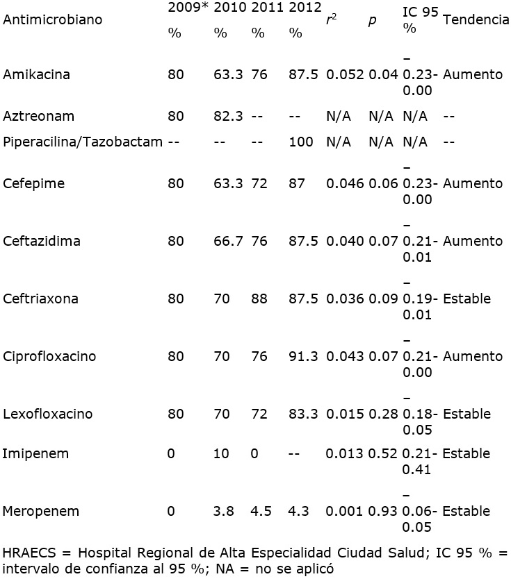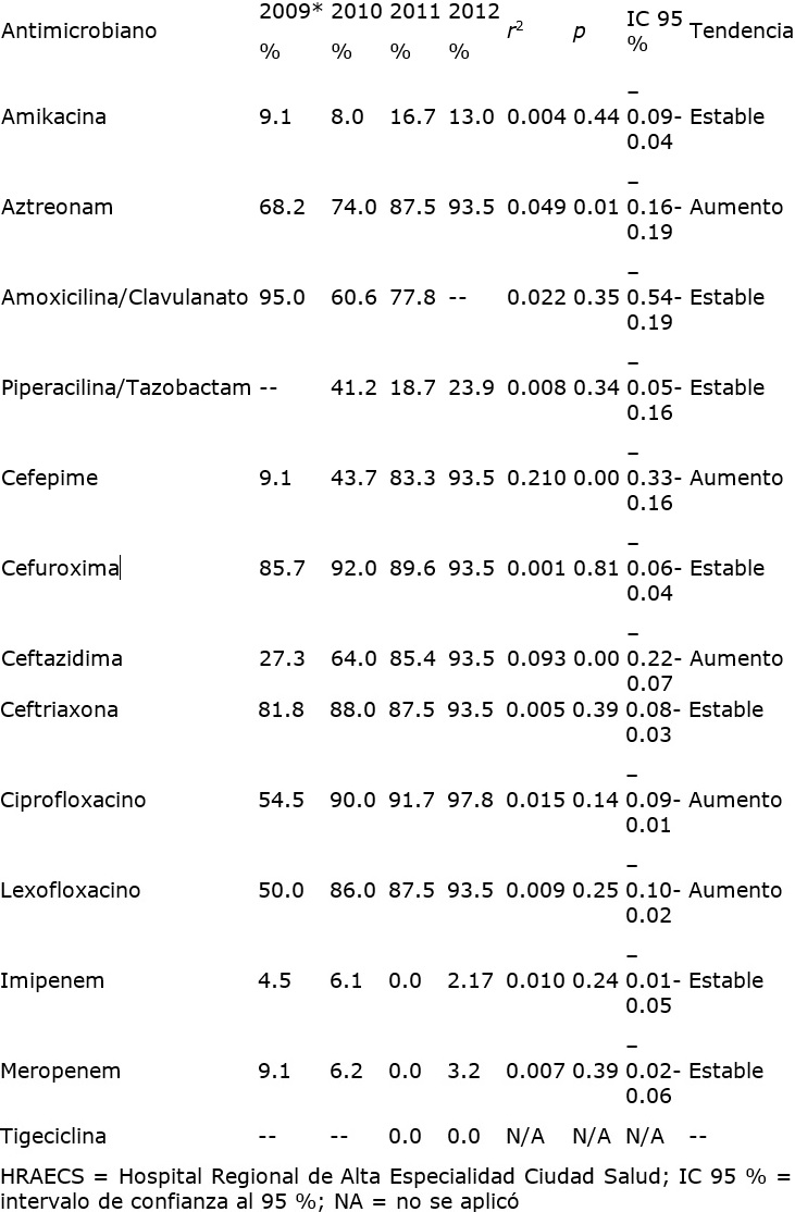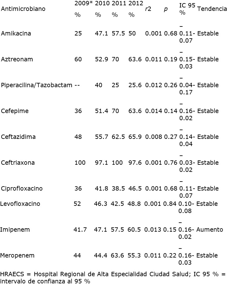 Las bacterias Gram negativas, con excepción de Klebsiella pneumoniae, mostraron una tendencia general al aumento en sus patrones de resistencia a antimicrobianos durante el periodo. Pseudomonas aeruginosa pasó de 47.1 al 60.5 % de resistencia a imipenem de 2010 a 2012, aunque no se observó significación estadística (cuadro III), mientras que Escherichia coli mostró el aumento significativo de la resistencia a aztreonam, cefepime y ceftazidima (p < 0.01, 0.00 y 0.00, respectivamente) (cuadro IV). De forma muy interesante, Klebsiella pneumoniae mostró una disminución significativa en la resistencia a la amikacina y la piperacilina/tazobactam (p < 0.03 y 0.00, respectivamente), además de la disminución en la resistencia al levofloxacino, imipenem y meropenem (p < 0.16, 0.08, 0.08, respectivamente) y un aumento en la resistencia al cefepime (p < 0.19) (cuadro V). En el cuadro VI se observa que Acinetobacter baumannii mostró un incremento significativo en la resistencia a la amikacina (p < 0.04), así como el incremento en la resistencia al cefepime, la ceftazidima y el ciprofloxacino (p < 0.06, 0.07 y 0.07, respectivamente).