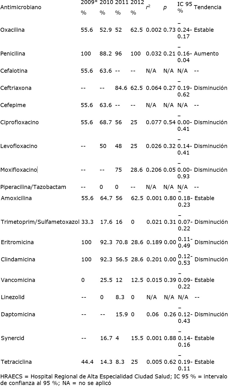 Las bacterias Gram positivas mostraron una gran sensibilidad a la daptomicina, pues únicamente encontramos resistencia del Staphylococcus aureus durante el año 2011 (15.9 %), mientras que el S. epidermidis y el Enterococcus faecalis no presentaron resistencia en los dos años en que se contó con datos para este fármaco (2011 y 2012). La vancomicina continúa siendo efectiva contra gérmenes Gram positivos, a pesar de que se encuentran resistencias por parte de S. epidermidis, E. faecalis y S. aureus con tendencias estables sin cambios estadísticamente significativos. Los patrones de resistencia permanecieron estables para S. epidermidis y E. faecalis en penicilinas, cefalosporinas, fluoroquinolonas y macrólidos, mientras que para S. aureus se observaron tendencias a la disminución de resistencia frente a ceftriaxona, ciprofloxacino, levofloxacino, moxifloxacino, trimetoprim/sulfametoxazol, eritromicina y clindamicina (cuadro VII).