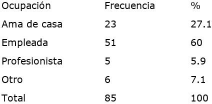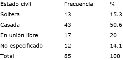 Se hizo un estudio transversal descriptivo con expedientes de pacientes embarazadas que acudieron a control prenatal con su médico familiar o al servicio de EMI en unidad médica mencionada. La muestra estimada fue de 85 pacientes. No hubo pérdidas en el estudio. Las características sociodemográficas identificadas fueron: la edad de 17 a 44 años, con una media de 26.98 y una moda de 23.00. El estado civil que predominó fue casada con un 50 %, seguido de unión libre con un 20 % (cuadro I). Se encontró que el 60 % eran empleadas (cuadro II) con una escolaridad de preparatoria en el 36.4 % y secundaria en un 30.5 % (cuadro III). Respecto al número de parejas sexuales no se especificó en el expediente clínico en el 100 % de los casos. La prueba rápida para detección de anticuerpos contra el VIH se hizo en un 92.9 % de las mujeres embarazadas de esta unidad. El resultado de estas pruebas se encontró positivo en un 0 % y negativo en el 82.4 %, debido a que en un 10.6 % no se especificó el resultado de la prueba en el expediente clínico (cuadro IV). Esta prueba se llevó a cabo en el segundo trimestre del embarazo del 56.47 % de los casos, por lo que se pudieron hacer detecciones oportunas en el primer trimestre solo en el 17.65 % de los casos (figura 1).