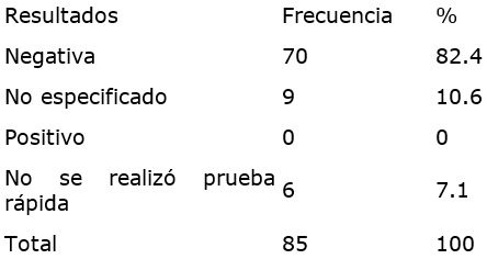 Resultados: se revisaron 85 expedientes de pacientes en control por embarazo. La prueba rápida (PR) para detección de anticuerpos contra el VIH se le aplicó a 79 pacientes (93 %). En nueve (10 %), no se encontró reporte del resultado en el expediente. En seis pacientes del total de la muestra (7 %) no se solicitó o realizó la PR. El resultado de todas las pruebas rápidas reportadas fue negativo a VIH.