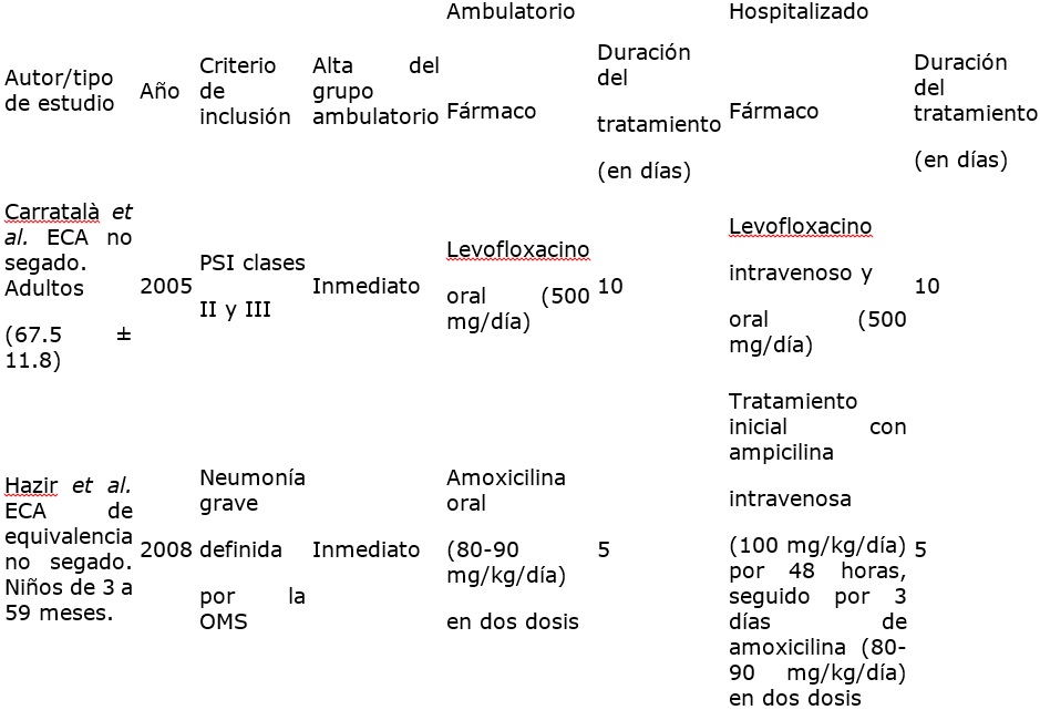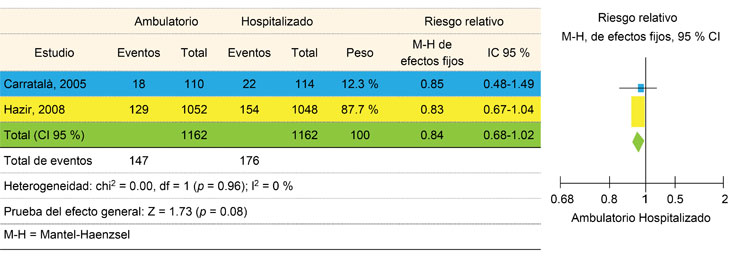 Conclusión: la evidencia muestra que no existen diferencias estadísticamente significativas entre el tratamiento ambulatorio y el tratamiento hospitalario de la neumonía adquirida en la comunidad.