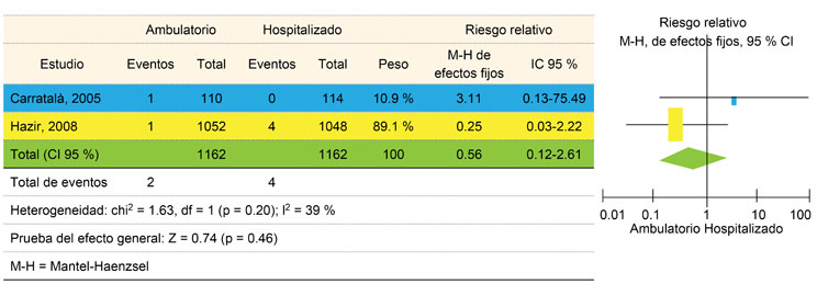 La seguridad fue evaluada mediante la determinación de la mortalidad. El grupo asignado a tratamiento ambulatorio tuvo una incidencia del 0.17 % (dos pacientes de 1162), mientras que la incidencia del grupo asignado a hospitalización fue de 0.34 % (cuatro pacientes de 1162) con una RR de 0.56 (IC 9 % 0.12-2.61) (I2 = 39 %) (figura 3).