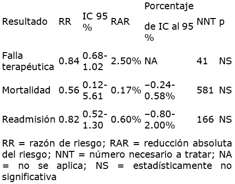El metaanálisis muestra que el tratamiento ambulatorio de la NAC severa tiene resultados similares, en términos de eficacia y mortalidad (cuadro II), al tratamiento hospitalario en pacientes adultos y en población pediátrica con NAC leve de acuerdo con la escala de gravedad de la neumonía y en pacientes pediátricos de 3 a 59 meses de edad con NAC grave según los criterios de la OMS. Esto sucede inclusive si mostramos una tendencia a favor del tratamiento ambulatorio.