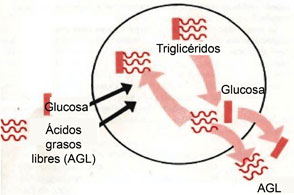 En sus trabajos iniciales, bajo la tutela de Edward H. Ahrens, Hirsch adquirió una gran habilidad en las técnicas de extracción y purificación de los lípidos tanto circulantes como extraídos del tejido adiposo, lo cual le permitió establecer que existía una diferencia tanto del tipo de lípidos como de la cantidad de adipocitos entre las personas obesas si se las comparaba con las que tenían un peso corporal normal. Hirsch pudo demostrar en experimentos con roedores que si se les hacía una lipectomía parcial aparecía hiperfagia, la cual llevaba rápidamente al incremento de tejido adiposo; gracias a esto, propuso que el almacenamiento de grasas regulaba el apetito a nivel del cerebro (figura 2). Como resultado de la colaboración entre Ahrens y Hirsch se consiguió el desarrollo de mejores técnicas de cromatografía para la identificación de los lípidos y la función clave que poseían los ácidos grasos libres.3,4A finales de la década de 1950 logró obtener adipocitos subcutáneos mediante la técnica de aguja fina; de esta manera, facilitó el estudio de los adipocitos al demostrar que los triglicéridos constituían el principal componente de la vía metabólica y la portación energética. Visto de otra manera, concluyó que la glucosa circulante ingresa a la célula y se transforma en glicerol-6-fosfato, al que de inmediato se le unen los ácidos grasos libres y de esta manera retornan a la circulación en forma de triglicéridos; además, la cantidad remanente de los ácidos grasos era reciclada para servir como precursora de nuevos triglicéridos (figura 3).5,6