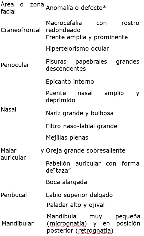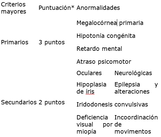El diagnóstico se realiza en la infancia con base en los criterios principales de megalocórnea primaria, hipotonía congénita, retardo mental de grado variable y retraso del desarrollo psicomotor. Existen también alteraciones secundarias como las oculares: hipoplasia del iris, iridodonesis y deficiencia de agudeza visual por miopía; y las neurológicas como epilepsia, otras alteraciones convulsivas y anormalidades en coordinación de movimientos (cuadro I).5 El dismorfismo facial del síndrome define el fenotipo de la enfermedad y comprende anomalías menores que no requieren intervención médica y que suelen describirse por áreas o regiones y se detallan en el cuadro II.6La cara tiene un aspecto peculiar con rostro redondeado, una frente amplia y prominente por protusión de la región frontal; los ojos muestran una separación mayor de lo normal por hipertelorismo ocular, valorable en aumento de la distancia interpupilar (figura 1). Existe un repliegue cutáneo palpebral de epicanto sobre el canto interno ocular, las fisuras palpebrales son amplias de aspecto almendrado, con inclinación descendente por descenso en colocación del canto externo.7 La parte media facial muestra mejillas llenas por incremento del tejido blando, localizado entre los arcos cigomáticos y la región del maxilar inferior, lo cual da un aspecto prominente y redondeado de ambas mejillas. El pliegue o filtrum nasolabial es amplio y su depresión muy superficial; la boca es alargada de labios finos; la región mandibular muestra un mentón poco desarrollado con maxilar inferior pequeño (micrognatia) y de localización posterior (retrognatia) (figura 2).8
