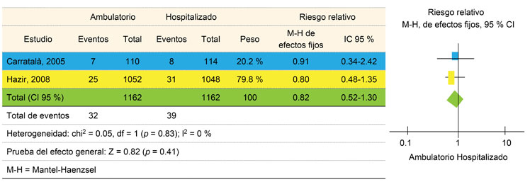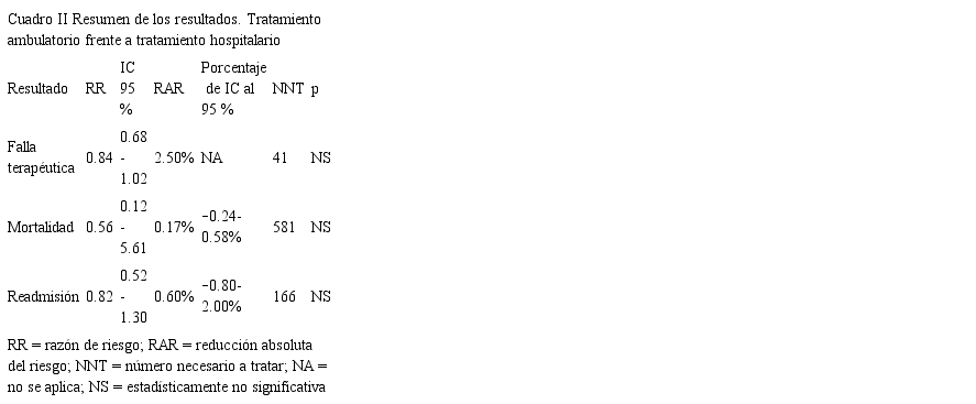 Conclusión: la evidencia muestra que no existen diferencias estadísticamente significativas entre el tratamiento ambulatorio y el tratamiento hospitalario de la neumonía adquirida en la comunidad.