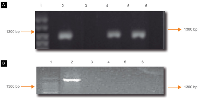 Electroforesis de PCR diferenciando M. avium de M. intracellulare. A) Amplificación con iniciadores MAV1/ MAV2. Carril 1, marcador (Promega) de 100 bp; carril 2, ADN (control positivo) de M. avium; carril 3, ADN de M. intracellulare; carriles 4 y 5, ADN de cepas desconocidas; carril 6, agua (control negativo). B) Amplificación con iniciadores MIN1/MIN2. Carril 1, marcador (Promega) de 100 bp marker; carril 2, ADN de M. intracellulare (control positivo); carril 3, ADN de M. avium; carriles 4 y 5, ADN de cepa desconocida; carril 6, agua (control negativo)