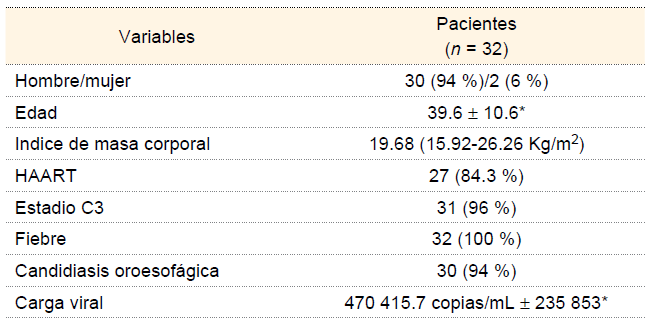De los 32 pacientes estudiados con M. avium, la mayoría se ubicó en el grupo etario de 40-49 años con 11 pacientes (34 %). El peso promedio fue de 56.9 kg ± 12.1, la talla promedio fue 1.70 m ± 0.10. La ocupación mayormente referida fue empleado, por 9 pacientes (28 %). La pérdida de peso se presentó en 30 pacientes (94.4 %), la fatiga y el malestar general en 28 (87.5 %) en ambos casos. Una patología agregada común fue neumonía/neumonitis en 12 pacientes (37.5 %). El valor promedio de leucocitos fue de 3801.7/mm3 ± 2409.9. La forma de presentación más frecuente fue la diseminada en 23 pacientes (71.8 %), y los órganos más afectados por M. avium en orden de frecuencia fueron: pulmón con 23 pacientes (71.8 %), hígado y médula ósea con 18 pacientes (56.2 %) en ambos casos. El hemocultivo fue el tipo de muestra con el mayor porcentaje de aislamientos positivos con 18 casos (56.2 %), seguido del mielocultivo con 12 (38.9 %). En la tele de tórax en 25 pacientes (78 %) se observaron alteraciones, predominando el infiltrado diseminado micronodular/macronodular. En el cuadro I se presentan las características de los pacientes del estudio.