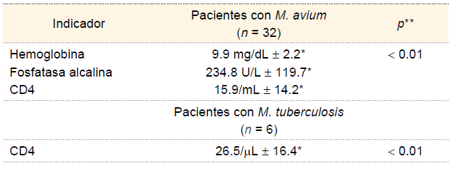 La mayoría de los pacientes con MAC, presentó cifras de hemoglobina bajas y de fosfatasa alcalina altas, asimismo presentaron un valor medio de T CD4 de 15.9/mL, resultando significativo al comparar con las células de pacientes con TB, (cuadro II). De los 32 pacientes, 5 fallecieron (15.6 %).