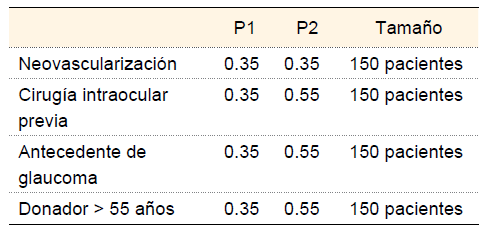 Para determinar la frecuencia de rechazo corneal se calculó el tamaño de la muestra en base para determinar con exactitud una proporción de un 40 % en una población dada con una exactitud de un 90 %. Se calculó el tamaño de muestra para cada uno de los factores de riesgo se realizó en base a diferencia de proporciones (cuadro I). El cálculo se realizó en el programa Epi info versión 3.4.3 – 2010’. Alfa de: 0.10, Poder de 0.80