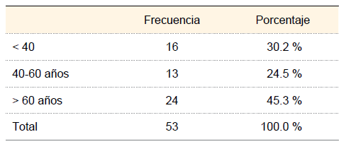 En el presente estudio se revisaron 150 expedientes de pacientes operados por trasplante de córnea, de los cuales 53 (35.3 %) presentaron rechazo del trasplante corneal. El rechazo fue más frecuente en la población masculina, con 31 pacientes (58.4 %), mientras que en la población femenina 22 pacientes (41.5 %) presentaron recahazo; el ojo derecho fue más afectado, con 29 (54.7 %) frente a 24 casos (45.2 %). La distribución por grupos de edad se muestra en el cuadro II. La distribución de casos de rechazo en función del diagnóstico preoperatorio se muestra en el cuadro III.