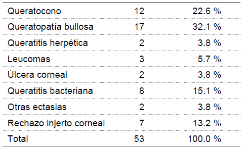 A diferencia de lo reportado en la literatura, la cual menciona que la causa más frecuente de trasplante corneal es el queratocono, en nuestra población estudiada la principal indicación de queratoplastia penetrante fue por queratopatía bullosa, debido al promedio de edad de los pacientes que fueron sometidos a este tratamiento.