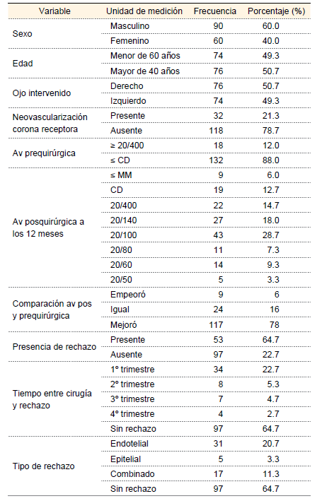 La mayoría de los pacientes (81.3 %) lograron mejoría de la agudeza visual respecto a la prequirúrgica, solo 28 pacientes tenían cuenta dedos o peor, de estos la mitad (14 casos) presentaron episodio de rechazo corneal.