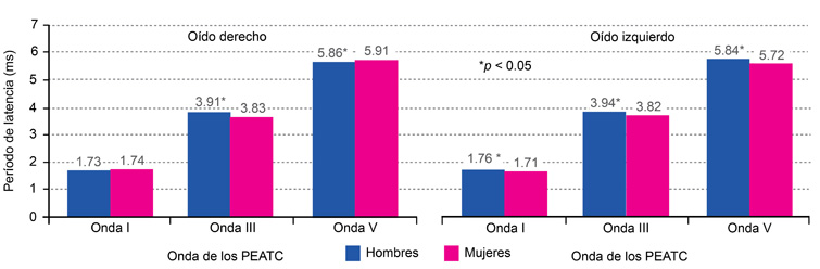 Se realizó un análisis comparativo por sexo; en el oído izquierdo, las mujeres presentaron periodos de latencias más cortas en comparación con los hombres. Este patrón fue similar en el oído derecho, aunque solamente en la onda III (figuras 1 y 2).
