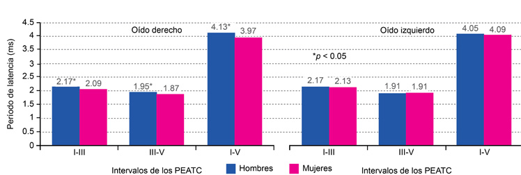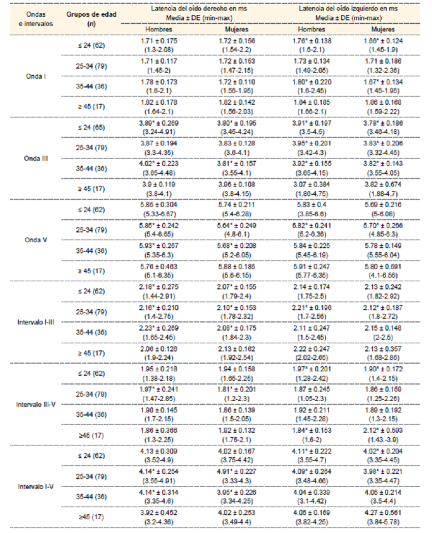 Los hallazgos de este estudio muestran las diferencias encontradas entre hombres y mujeres, de acuerdo con los grupos de edad que se construyeron. Se observaron diferencias en los tiempos de latencia en todos los grupos de edad, principalmente en el grupo de 25-34 años y 35-44 años, que abarcaron las ondas III y V y los intervalos I-III y I-V, similar a los resultados reportados por Michalewsky et al. y Houston et al.13,14