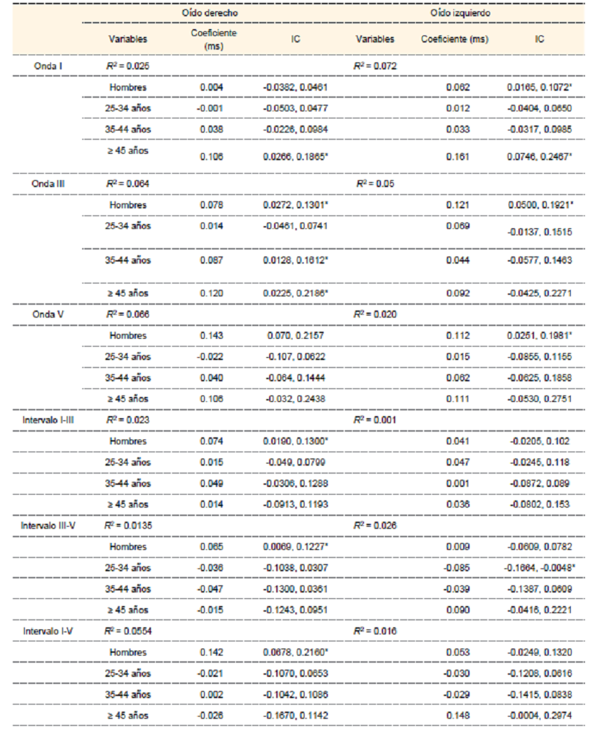 En el modelo que incluyó sexo, las latencias promedio en ambos oídos mostraron diferencias estadísticamente significativas en las ondas III y V, así como en los intervalos I-III y I-V. También se encontraron diferencias en las ondas I y III en el grupo de ≥ 45 años, en comparación con el grupo de menor edad que se tomó como referencia (cuadro II).