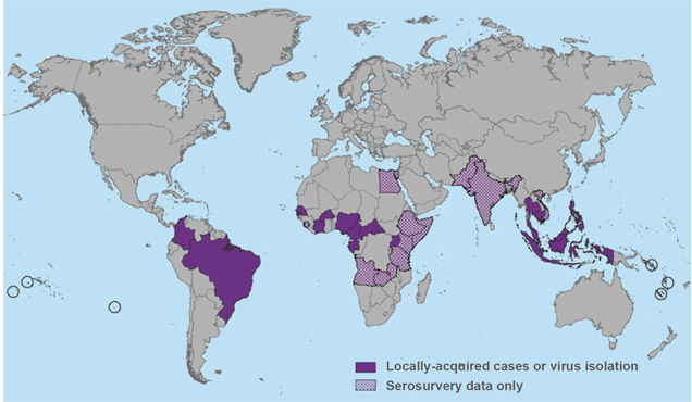La especie Aedes aegypti está confinada a las zonas tropicales y subtropicales, mientras que la especie Aedes albopictus está presente en regiones templadas, e incluso templadas-frías. En los últimos decenios Ae. albopictus ha salido de Asia y se ha establecido en algunas zonas de África, Europa y las Américas.2