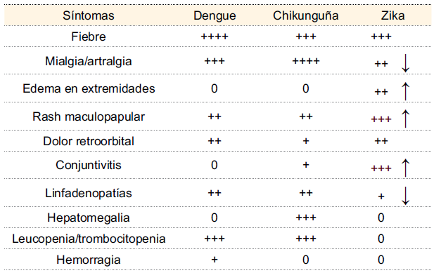 En comparación con el dengue, la infección por ZIKV ocasiona manifestaciones clínicas leves, el inicio de la fiebre es más agudo y su duración más corta. Por otra parte, el dengue puede tener una evolución más tórpida, ocasionando inclusive la muerte