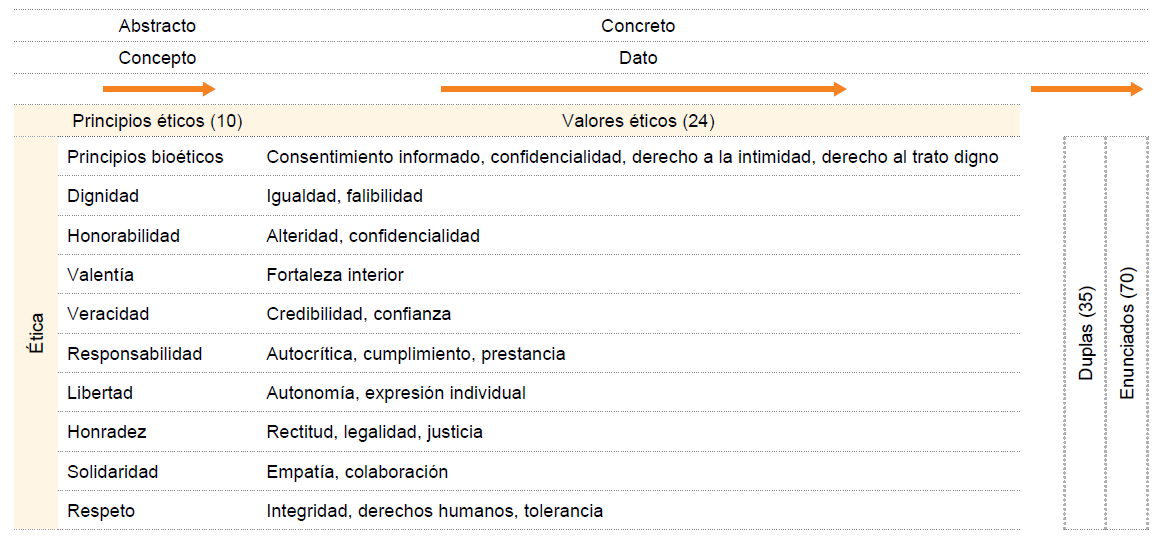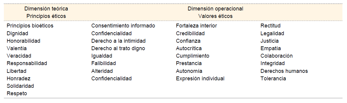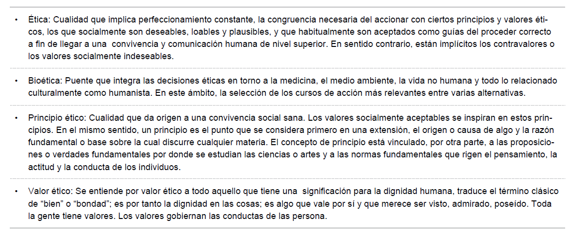 Dimensión conceptual. Incluye 5 conceptos generales en torno a la ética y que se calificaron de relevantes para su estudio, comprensión e interpretación: bioética, ética, moral, principios éticos y valores éticos. Todos fueron definidos para evitar la confusión semántica que frecuentemente los acompaña (anexo 2).